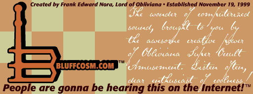 Sunday 7/15/01 11:39 PM -- Here's a Bluffcosm update. On 6/9/01, I recorded "Classictronica #2", which I am still editing. On 7/2/01, I went to 17 malls in one day and recorded "Tap-a-Mall #1" (no production work done yet). Later on today, I am planning on recording "Blufftoon Time #2". There will be no Blufftoon Waves for June or July 2001. I've been working on the future of Obliviana over the past few weeks, trying to come up with a new direction for Obliviana Day, July 28. I have developed some very interesting ideas, but I'm not sure exactly what the new direction is gonna be. All this development work will be revealed once I get caught up with OsoaWeek (which has fallen way behind). So don't worry... Bluffcosm and Obliviana are still alive!