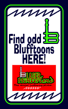 Thursday 5/31/01 11:16 PM -- The May 2001 Wave of Blufftoon has finally arrived! May has been a really fucked-up month here at Bluffcosm... but I managed to produce a dazzling array of little audio gems for ya! With this new stuff, there is now 29 hours and 39 minutes of sound in Bluffcosm. Isn't it time you got some of that good stuff into your ears? Come on! Let's go! In this Wave, there are a number of Blufftoons that I decided not to put on MP3.com... they're ones that I would have, in the past, put into Laser Hinterland... but I'm trying to figure out what I'm gonna do with that damn vague Hinterland, that "Major Junkway Plain". If ya wanna hear any of the stream-only Blufftoons, and you don't wanna wait for the stream to cycle, drop me an email and we'll just see if we can work something out! Here's a list of the new Blufftoons... Blufftoon 116: Blufftoon Time #1 -- (3:23:28) Imagine listening to a radio station where they played Blufftoons instead of music... and here ya go! Frank, Pete, and Jay play your favorite audio masterpieces... semi-live on tape from lovely Howell, NJ! (On Blufftoon TIme stream only) Blufftoon 117: Weird October Beast -- (2:20) It's a Weird October at Weird University... and there's something wrong with Will! And whatever happened to Maureen...? (On MP3.com and Blufftoon Shuffle stream) Blufftoon 118: Weird October Dreamer -- (4:31) It's a Weird October at Weird University... and why does Rob keep having these strange dreams...? (On MP3.com and Blufftoon Shuffle Stream) Blufftoon 119: Weird October Hitchhiker -- (8:06)It's a Weird October at Weird University... and John's a waiter who gets abused by customers, and then has to hitchhike home one day... (On MP3.com and Blufftoon Shuffle stream) Blufftoon 120: Weird October Spirit -- (1:58) It's a Weird October at Weird University... and Will, Rob, and John meet a mysterious stranger that they could all swear they've seen before... (On MP3.com and Blufftoon Shuffle stream) Blufftoon 121: Beublin 21: Anthony and Hazy -- (11:37) The last of the early '90s Beublin outtakes! Hear Melter Pluto guitarist Hazy Nopperty complain about Beublin! Hear additional footage from the Halloween party! Hear Anthony Neuro... um... talk about Beublin! (On Beublin Stream only) Blufftoon 122: Beublin 22: All My Helicopters -- (11:00) A brand new episode! Beublin A. Richardson gets thrown in jail and meets his old friend Horace Doom and ice-cream-store-bomber Gene Bossel. (On Beublin Stream only) Blufftoon 123: All My Helicopters (Radio Edit) -- (4:34) A streamlined version of Beublin 22. Beublin A. Richardson gets thrown in jail and meets his old friend Horace Doom and ice-cream-store-bomber Gene Bossel. (On MP3.com and Blufftoon Shuffle stream) Blufftoon 124: The Famous Cameracorder -- (1:45) Now that you got your car started, can I have some food? Listen, this world runs on a capitalistic sort of system. You are an alms beggar. I have no need for you. (On MP3.com and Blufftoon Shuffle stream) Blufftoon 125: The Arkanoid Player -- (1:59) Step back in time to Drew University in October 1986... the campus arcade... with Galaga and Eight Ball Deluxe in the background... Bryan is playing... playing Arkanoid! (On Blufftoon Shuffle stream only) Blufftoon 126: Pineapple -- (2:08) An alternate take from the original footage of the Blufftoon "Weird October Hitchhiker". John is a waiter who gets abused by his customers... (On Blufftoon Shuffle stream only) Blufftoon 127: The Sophomore Bathroom -- (5:06) Shyboy, Mink, and Wolf tell their tales of trouble and narcotics. From the beginning of the tape that ends with the Blufftoon "Throat Ripper Scene". (On Blufftoon Shuffle stream only) Blufftoon 128: The Interesting Man -- (16:44) Wolf, Shyboy, Lee, Mink, and Frank--five teenagers in approximately 1987. Hear Frank trying to be deep and artistic, and sounding like an absolute fool! From the middle of the tape that ends with the Blufftoon "Throat Ripper Scene". (On Blufftoon Shuffle stream only) Blufftoon 129: The Bluffcosm 5-Minute Vacation From Sanity #4 -- (5:00) Get 'em on film. Uh-oh. Hey Robert. What's up? Get your underwear back? No. Damn! Damn the system! (On MP3.com and Blufftoon Shuffle stream)