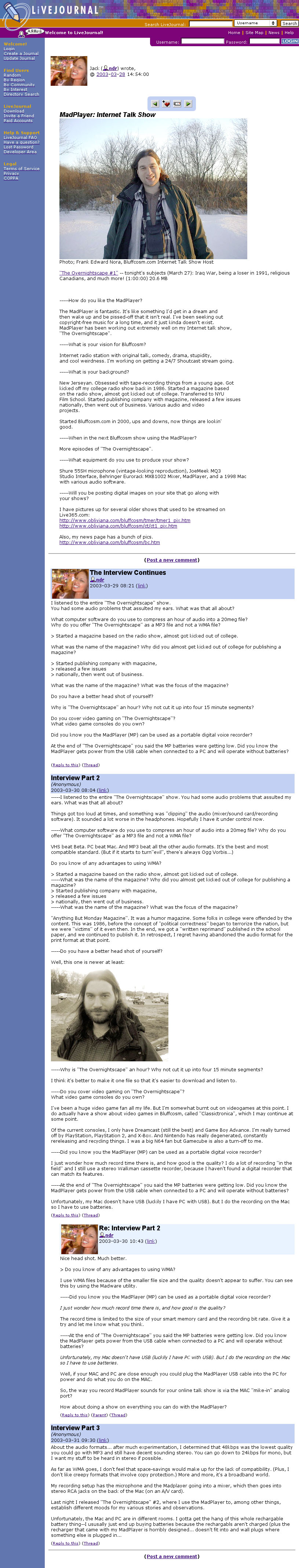 Saturday 3/29/03 2:24 AM Subj: Journal Entry: Bluffcosm Date: Friday, March 28, 2003 6:05:57 PM From: j_olmsted@yahoo.com To: obliviana@aol.com Hey Frank, I posted a link to Bluffcosm in my journal. http://www.livejournal.com/talkread.bml?journal=ndr&itemid=242623 I'm following MadPlayer apps. and the war, of cource. How do you like the MadPlayer? What is your vision for Bluffcosm? What is your background? When in the next Bluffcosm show using the MadPlayer? What equipment do you use to produce your show? Will you be posting digital images on your site that go along with your shows? Regards, -Jack Olmsted New Digital Reporter ------------- -----How do you like the MadPlayer? The MadPlayer is fantastic. It's like something I'd get in a dream and then wake up and be pissed-off that it isn't real. I've been seeking out copyright-free music for a long time, and it just kinda doesn't exist. MadPlayer has been working out extremely well on "The Overnightscape". -----What is your vision for Bluffcosm? Internet radio station with original talk, comedy, drama, stupidity, and cool weirdness. I'm working on getting a 24/7 Shoutcast stream going. -----What is your background? New Jerseyan. Obsessed with tape-recording things from a young age. Got kicked off my college radio show back in 1986. Started a magazine based on the radio show, almost got kicked out of college. Transferred to NYU Film School. Started publishing company with magazine, released a few issues nationally, then went out of business. Various audio and video projects. Started Bluffcosm.com in 2000, ups and downs, now things are lookin' good. -----When in the next Bluffcosm show using the MadPlayer? More episodes of "The Overnightscape". -----What equipment do you use to produce your show? Shure 55SH microphone (vintage-looking reproduction), JoeMeek MQ3 Studio Interface, Behringer Eurorack MXB1002 Mixer, MadPlayer, and a 1998 Mac with various audio software. -----Will you be posting digital images on your site that go along with your shows? I have pictures up for several older shows that used to be streamed on Live365.com: http://www.obliviana.com/bluffcosm/tmer/tmer1_pix.htm http://www.obliviana.com/bluffcosm/ct/ct1_pix.htm Also, my news page has a bunch of pics.