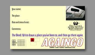 Name: Againgo The Deed: Write down a place you've been to, and then go there again. Introduced: Ts35 Printings: Dd005 (1/11/03) Black Envelope Random: 35-A Notes: Photo taken at a rest stop along Rt. 80 West in Pennsylvania. RETURN TO OBLIVIANA HOMEPAGE © 2003 |