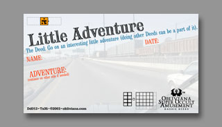 Name: Little Adventure The Deed: Go on a little adventure (doing other Deeds can be a part of it). Introduced: Ts35 Printings: Dd013 (1/11/03) Black Envelope Random: 35-A Notes: Background photo taken on Route 1/9 South in NJ. RETURN TO OBLIVIANA HOMEPAGE © 2003 |
